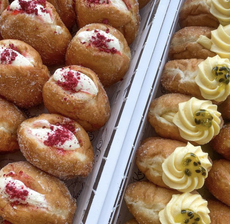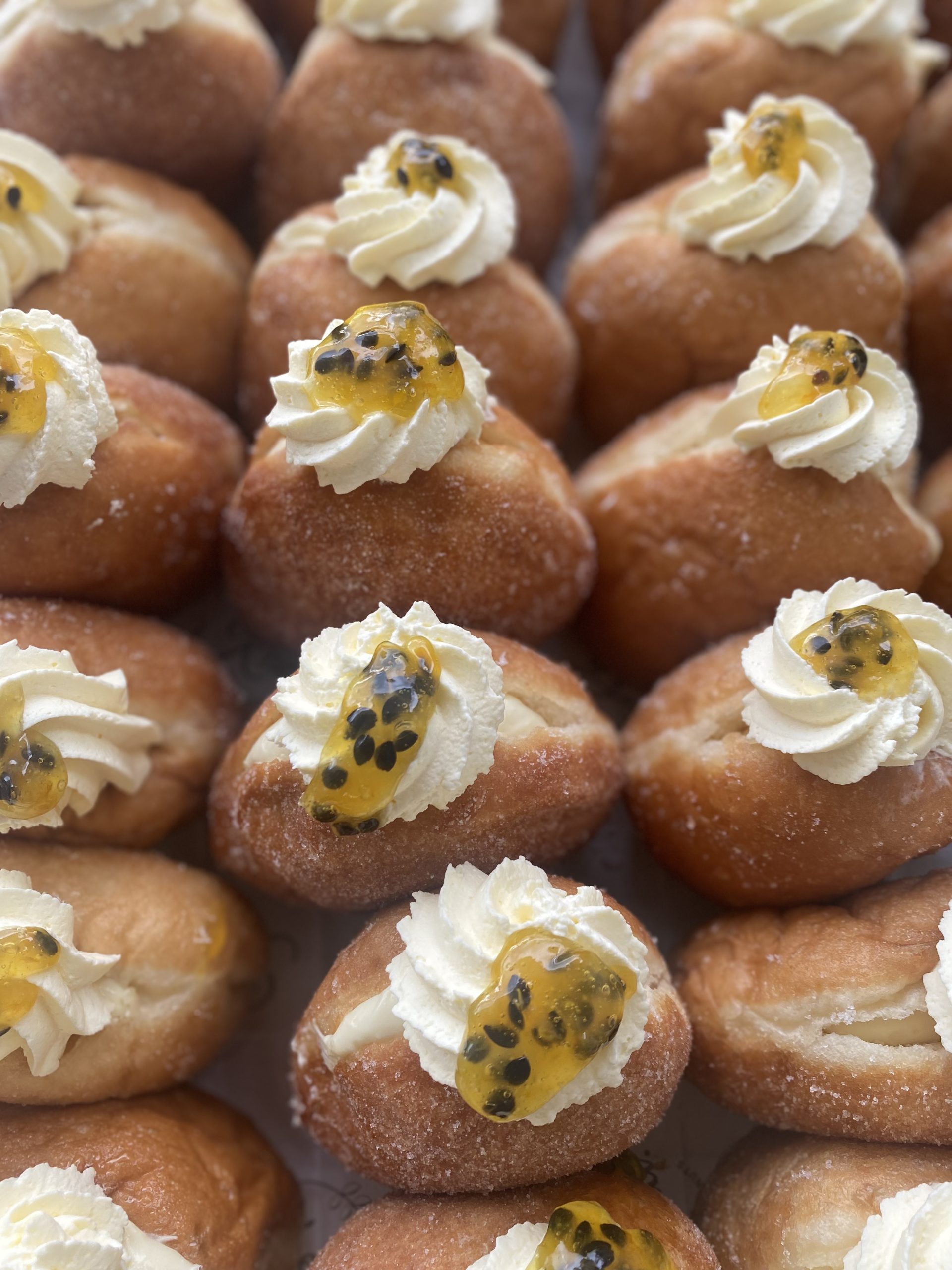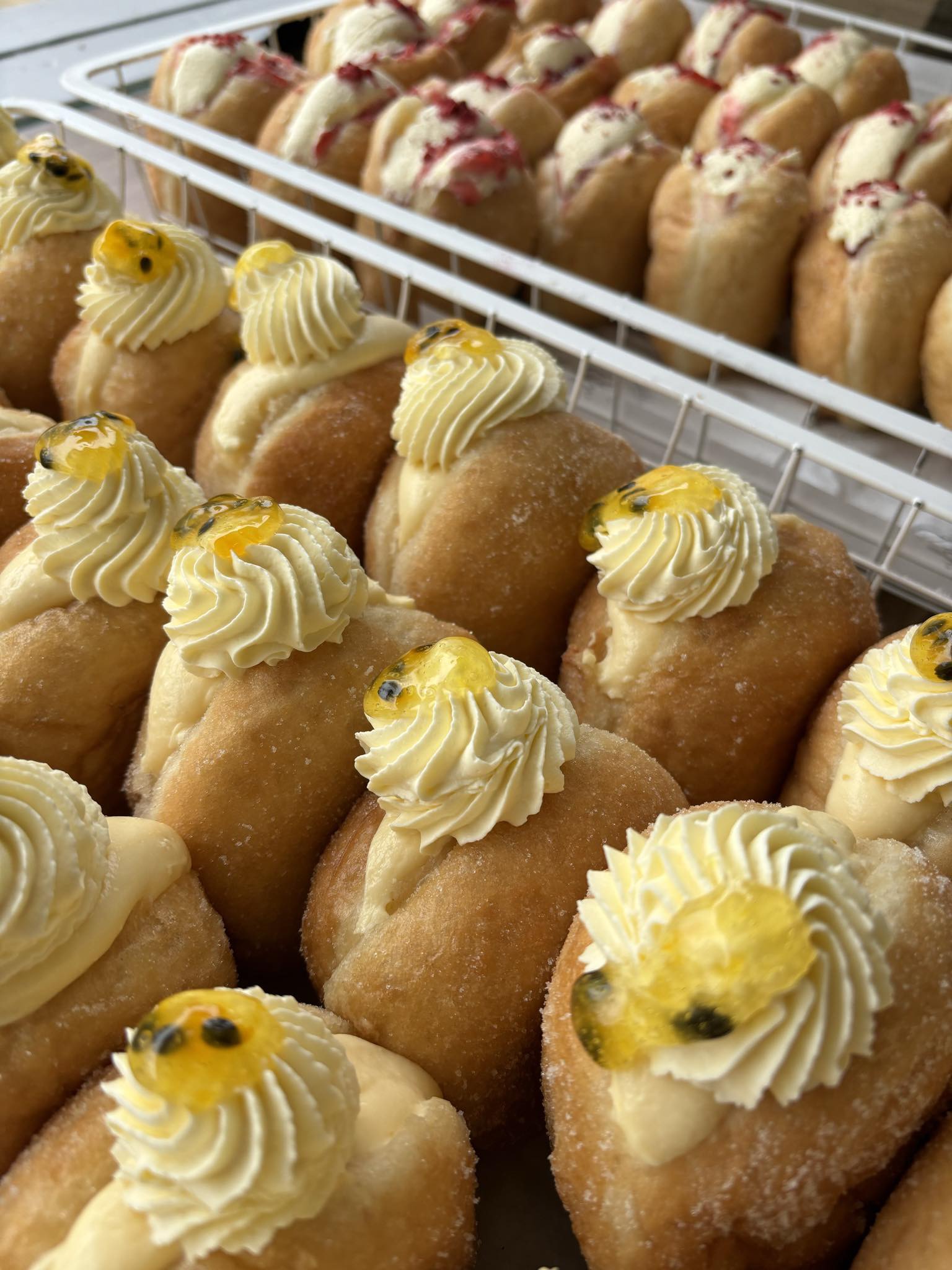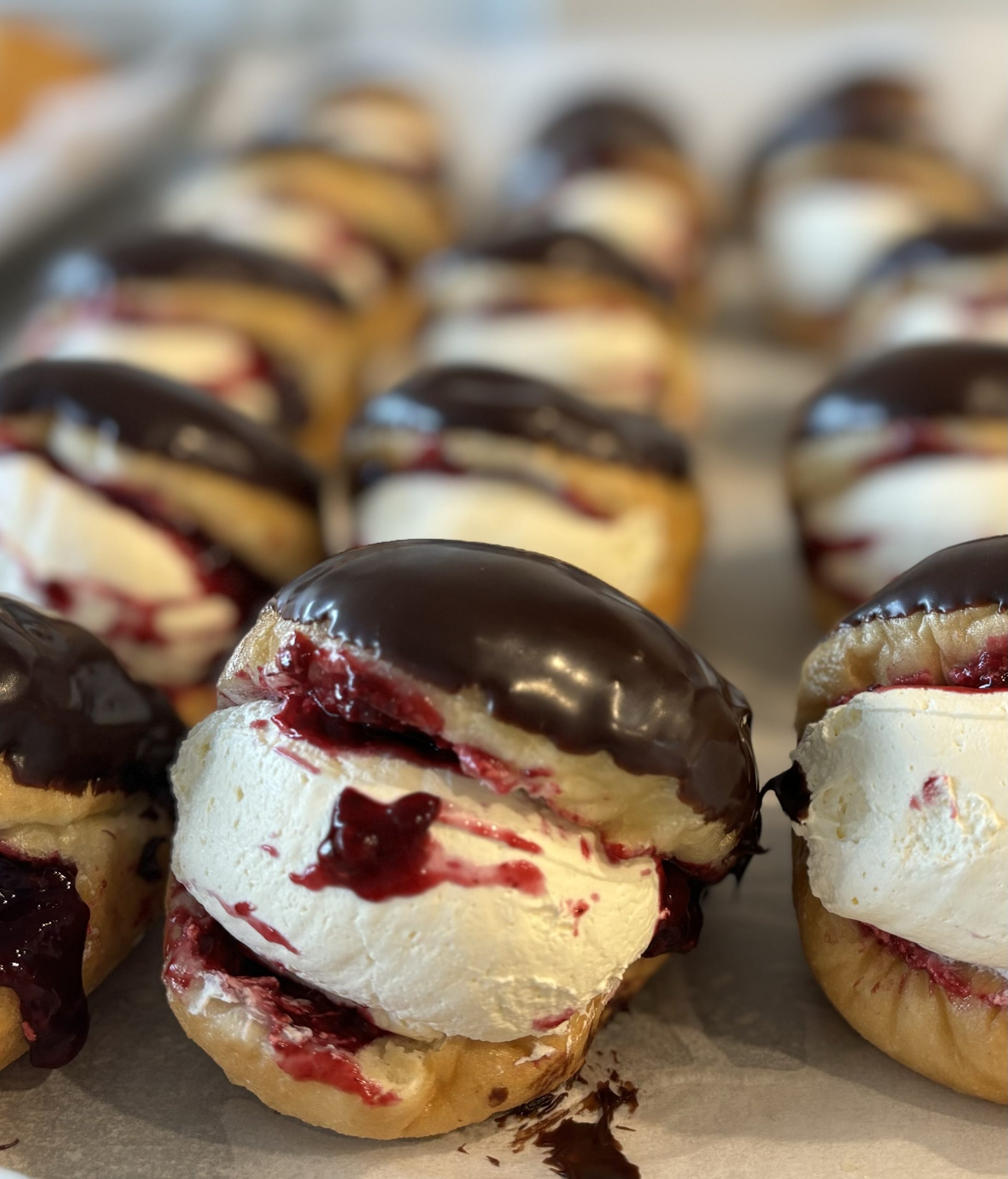 Boysenberry Bliss A tangy boysenberry compote gently folded into freshly whipped cream, then nestled inside our sugar-coated, hand-rolled fluffy donuts. It’s a perfect balance of tart and sweet, wrapped in golden comfort. -