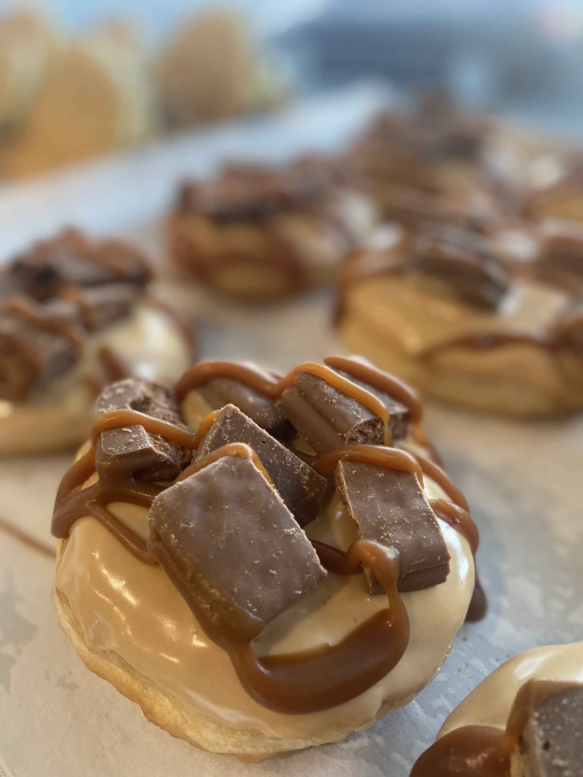 Velvety mousse made from melted Cadbury Caramilk chocolate, whipped to creamy perfection and paired with our freshly hand-rolled, fluffy donut. Finished with a decadent block of golden Caramilk on top—this one’s pure luxury in every bite.